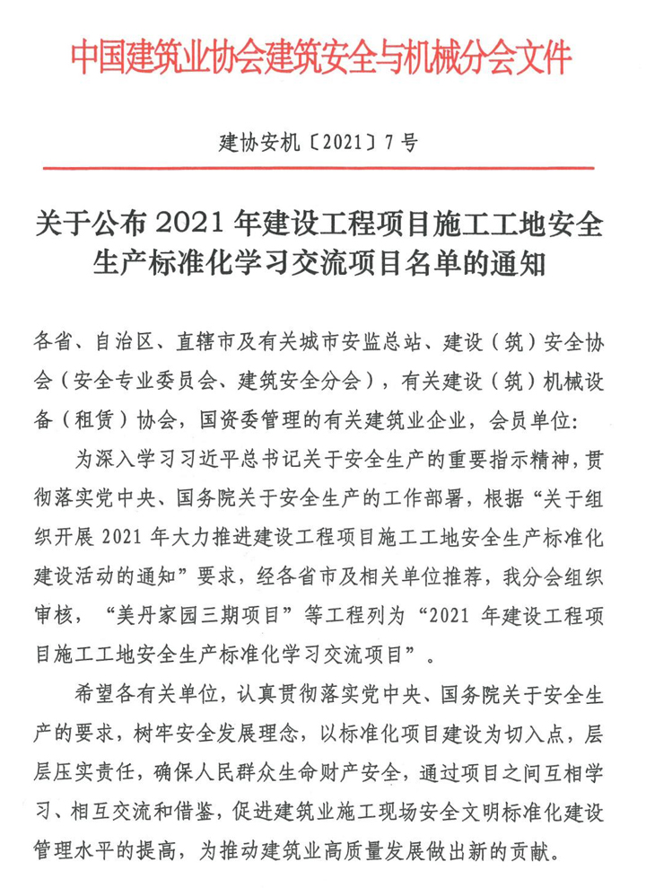 “建设工程项目施工安全生产标准化学习交流项目”是中国建筑业协会建筑安全与机械分会牵头组织开展的全国性的安全文明标准化工地评选活动,活动坚持优中选优的原则,每年开展一次,旨在推广优秀项目的先进经验和做法,树立全国性的安全文明标准化标杆项目,助推全国建设工程项目安全文明标准化水平不断提升。