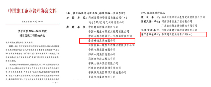 近日,中国施工企业管理协会印发了《关于表彰2020-2021年度国家优质工程奖的决定》,问鼎网页版登录入口承建的农业路快速通道工程(雄鹰东路-金源东街)和红旗渠精神营地项目双双荣誉入榜,至此公司实现了连续三年斩获国家优质工程奖。