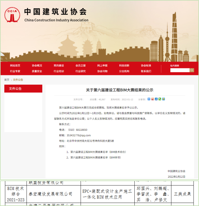 中国建筑业协会协会“第六届建设工程BIM大赛结果公示”文件
