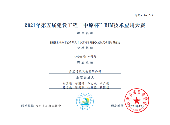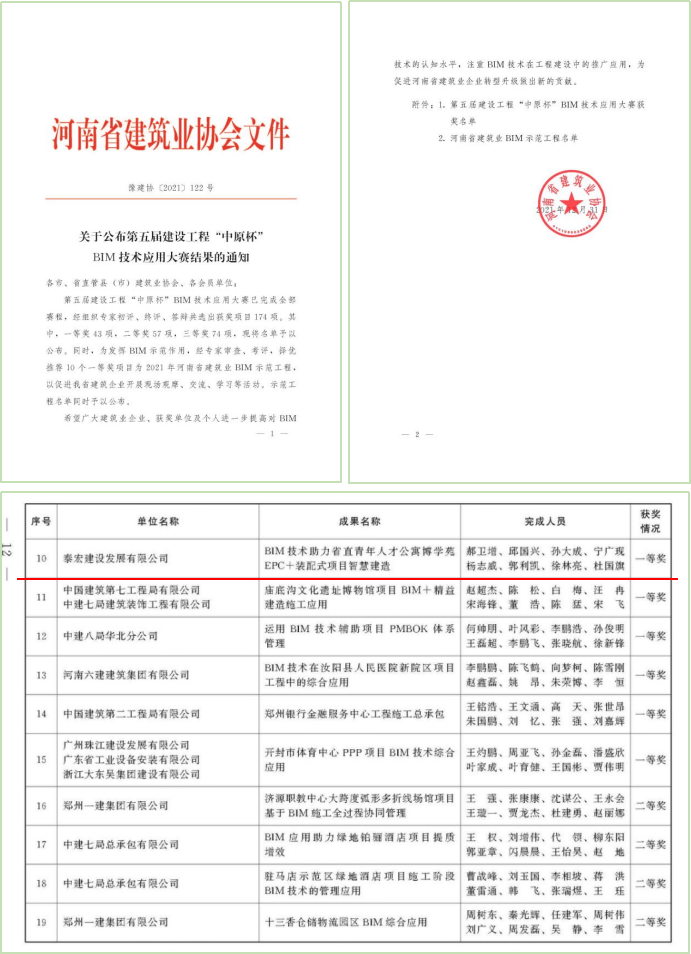 近日,中国建筑业协会公布了《第六届建设工程BIM大赛结果》、河南省建筑业协会颁发了《第五届建设工程“中原杯”BIM技术应用大赛》获奖证书,泰宏建设申报的《EPC+装配式设计生产施工一体化BIM技术应用》、《BIM技术助力省直青年人才公寓博学苑EPC+装配式项目智慧建造》BIM技术应用成果,分别荣获国家级BIM技术应用综合三类成果和“中原杯”BIM大赛综合组一等奖。