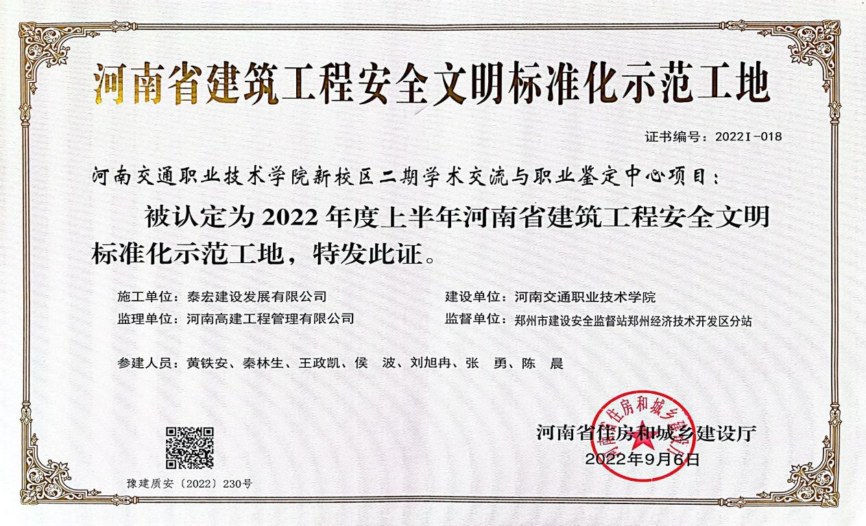 2022年9月份,河南省住建厅公布了“2022年度上半年河南省建筑工程安全文明标准化示范工地”名单,泰宏建设公司承建的河南交通职业技术学院新校区二期学术交流与职业鉴定中心、郑州轻工业学院东风校区改造建设工程—工程训练中心两项目荣获此项殊荣。