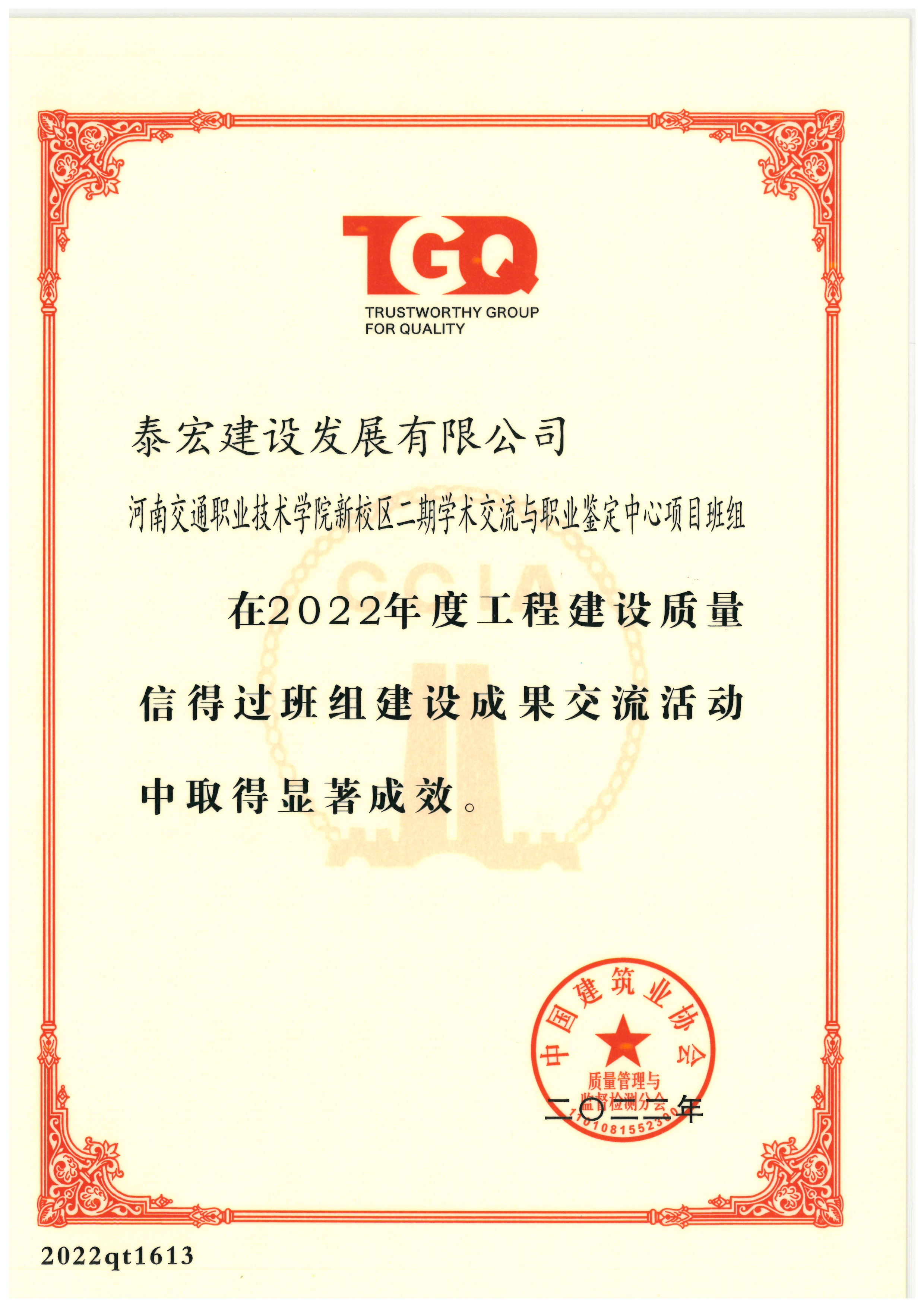 2022年12月份,由河南省建筑业协会评审推荐,中国建筑业协会质量管理与监督检测分会举办的工程建设质量信得过班组活动中,泰宏建设承建的河南交通职业技术学院新校区二期学术交流与职业鉴定中心项目申报的题为“精益建造,精细化管理,提质增效促发展”的工程质量信得过班组成果,经线上发布,评审专家评审和答辩,得到评审专家的一致好评,获得“2022年度工程建设质量信得过班组”。