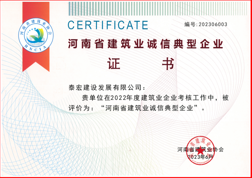 泰宏建设再次荣获“河南省建筑业诚信典型企业”