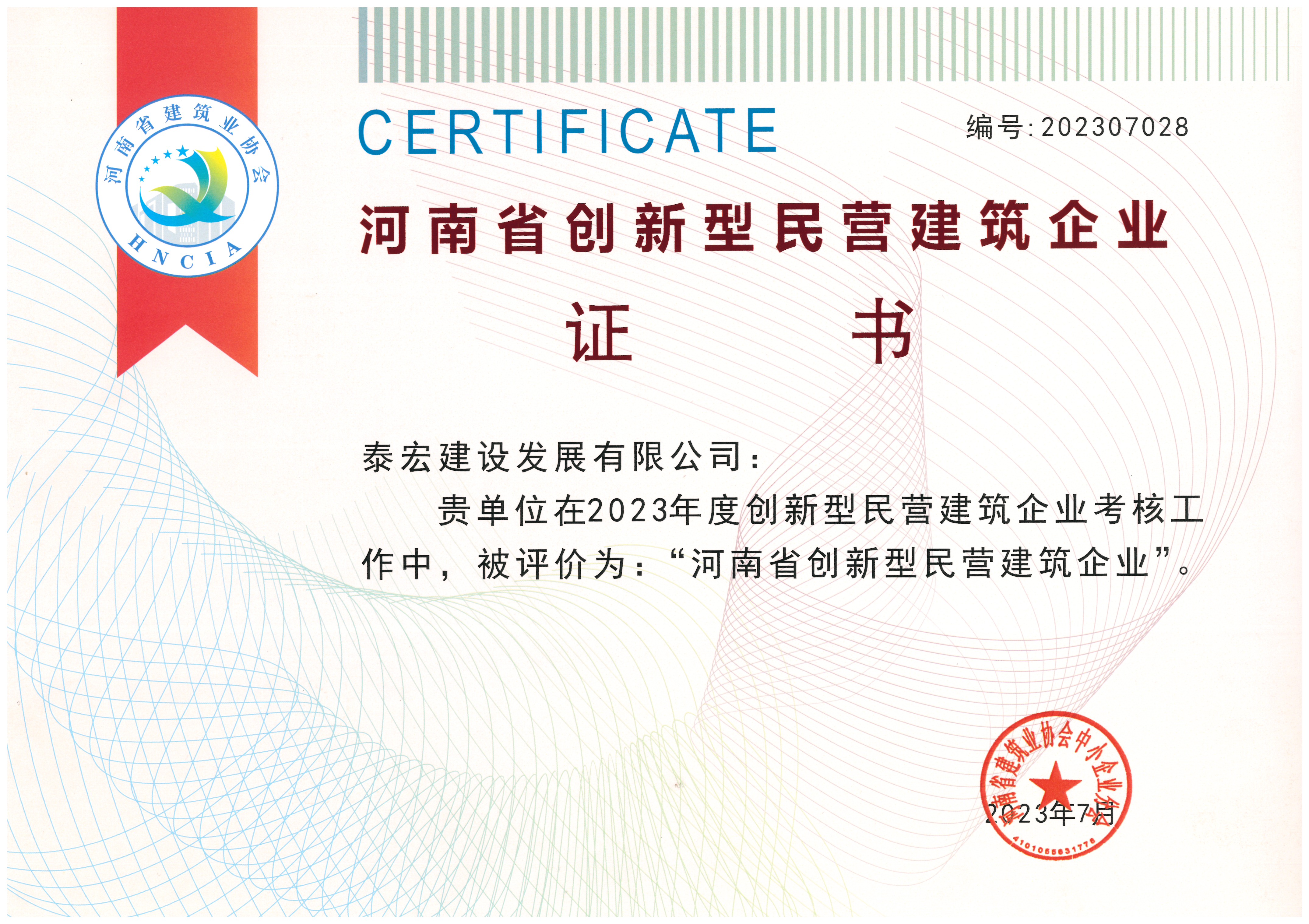 2023年7月,河南省建筑业协会中小企业分会公布了“2023年度河南省创新型民营建筑企业”名单。经专家组综合考核评价,问鼎网页版登录入口荣获“河南省创新型民营建筑企业”称号。