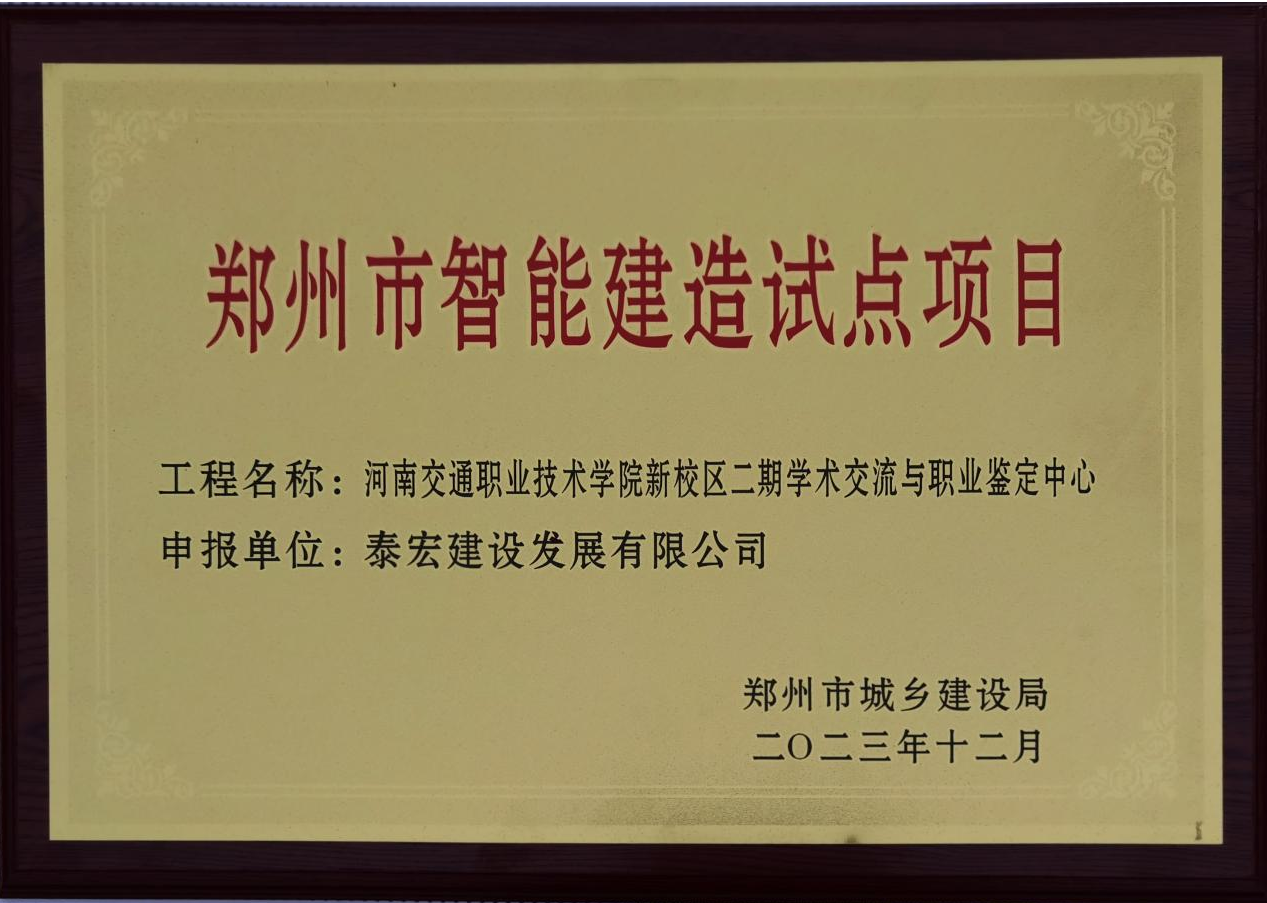 2023年12月13日,郑州市建筑业协会组织召开了“郑州市智能建造试点企业和试点项目评价标准宣贯培训交流会”,颁发了郑州市首批培育智能建造试点企业、项目牌,问鼎网页版登录入口入选首批郑州市智能建造试点企业,承建的省直青年人才公寓博学苑和河南交通职业技术学院新校区二期学术交流与职业鉴定中心两个项目,入选首批郑州市智能建造试点项目。