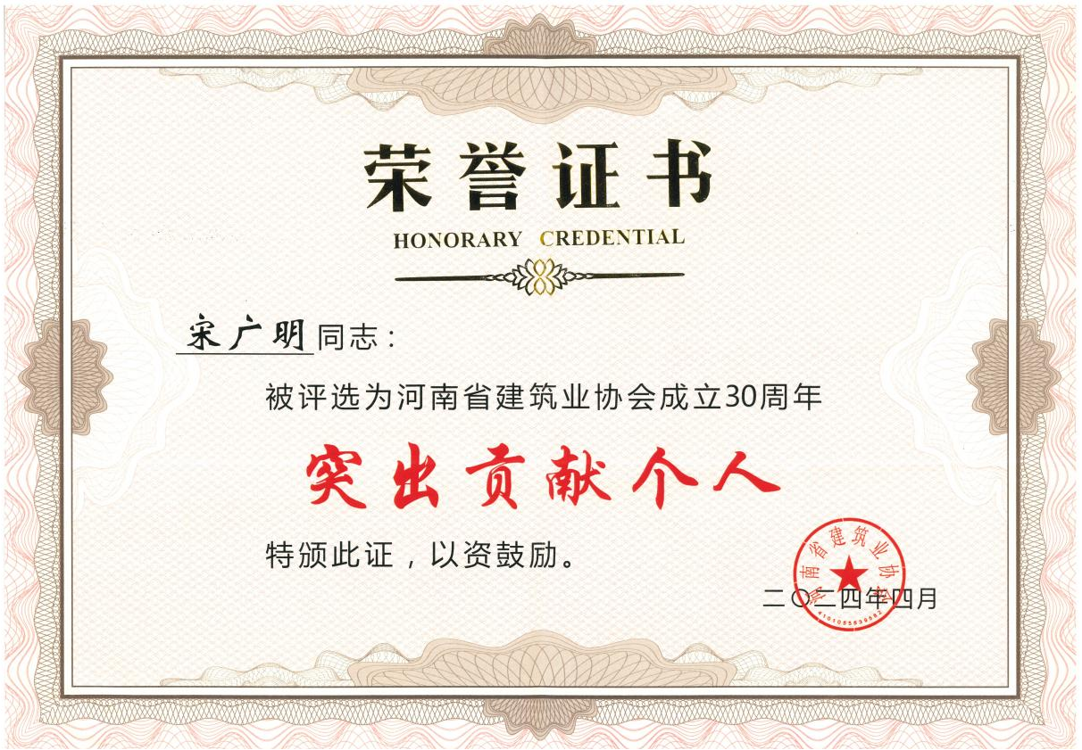 河南省建筑业协会成立30周年突出贡献个人荣誉证书