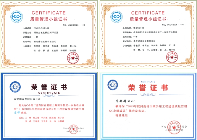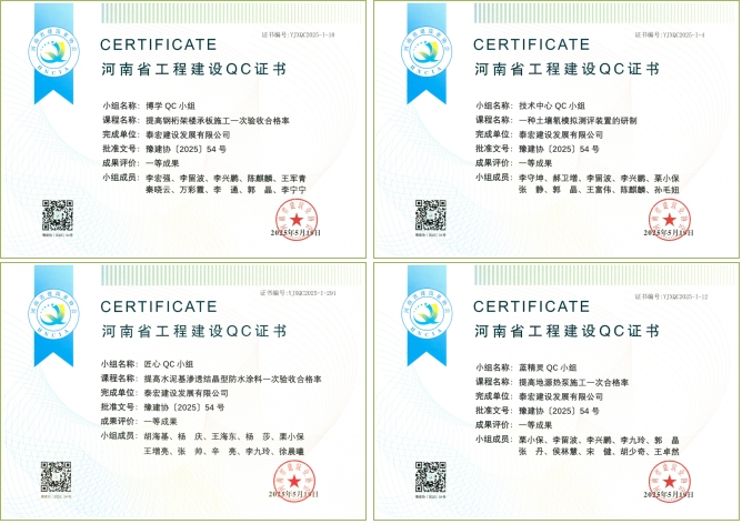 近日,泰宏建设领取了河南省建筑业协会颁发的4项QC成果证书。至此,泰宏建设申报的7项省级QC成果全部发布完成,均荣获一等奖,取得丰硕成果。其中,2项成果推荐至中国建筑业协会、中国市政协会进行发布。